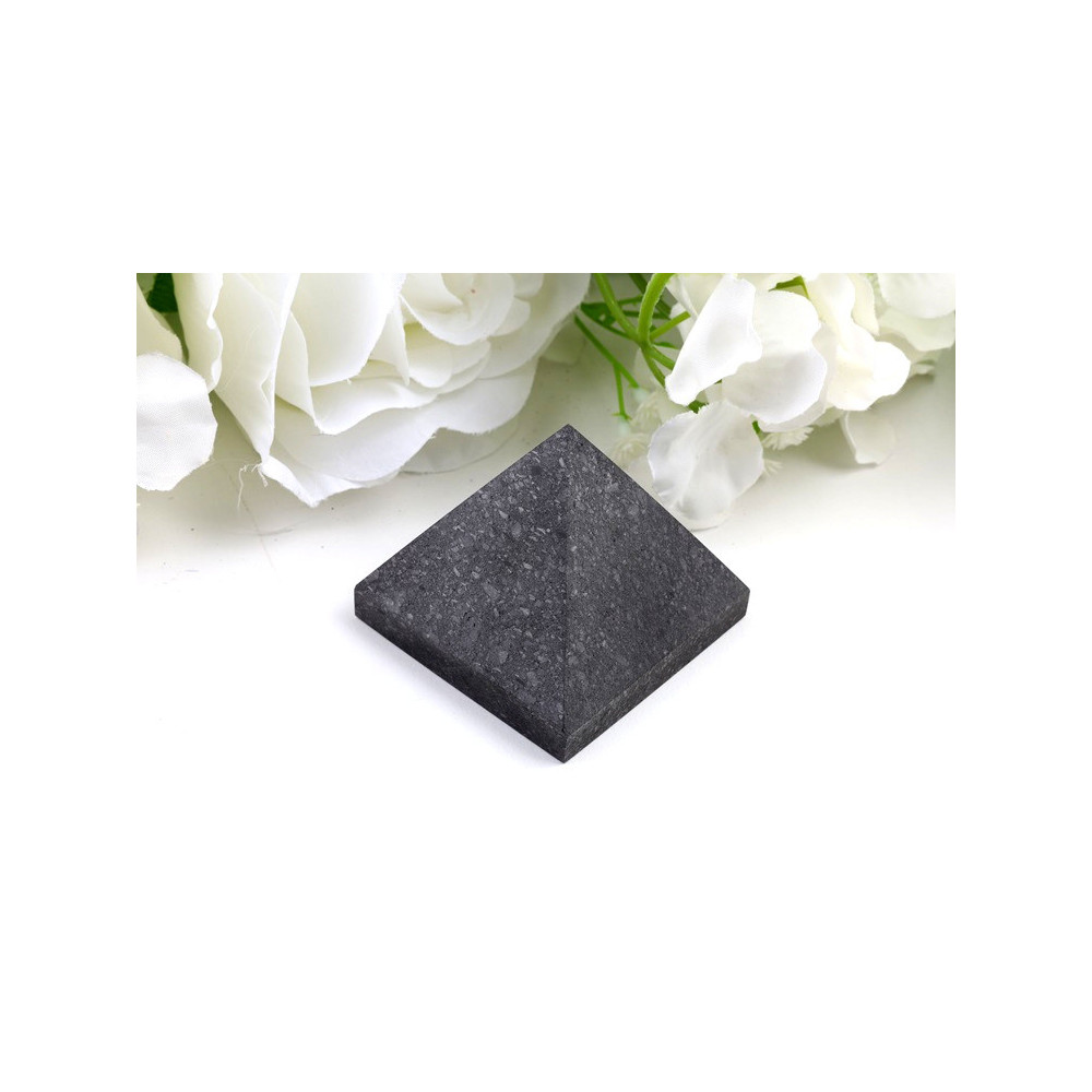 Tato jedinečná pyramida ze šungitu č. 707 se pyšní přírodním, neleštěným povrchem, který jí dodává autentický a zemitý vzhled. Její barva je hluboká, matná, tmavě šedá až černá, s jemnou zrnitou texturou, která svědčí o jejím přírodním původu. Každá plocha pyramidy je čistá a hladce vybroušená do přesného geometrického tvaru, zatímco neleštěný povrch zachovává syrovou krásu kamene bez jakýchkoli odlesků, což podtrhuje její mystický charakter. Je to skutečně originální kus.