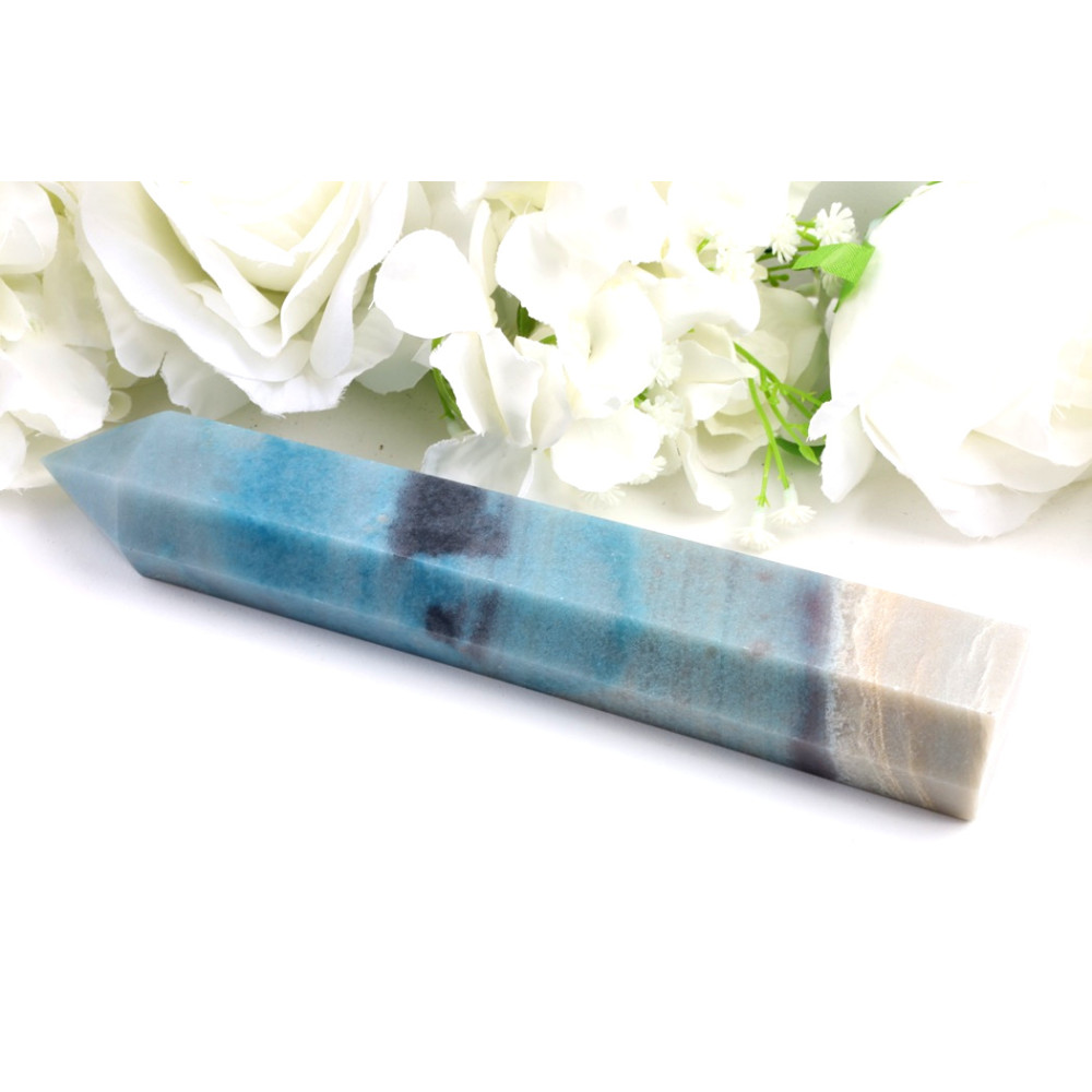 Tento jedinečný obelisk z trolleitu č. 1637 okouzluje svou paletou barev, kde se snoubí sytě tyrkysové a jemné nebesky modré tóny s klidnou šedí a krémově bílou. Místy se mihnou i náznaky purpurové, které dodávají kameni mystickou hloubku. Hladký, precizně leštěný povrch odráží světlo a zvýrazňuje elegantní, protáhlý tvar se šesti fasetami, zakončený ostrou špičkou, symbolizující směřování k vyšším sférám. Při detailním pohledu lze pozorovat fascinující páskování a nepravidelné inkluze tmavších minerálů, které podtrhují jeho ryzí přírodní původ a dodávají každému kusu nezaměnitelný charakter.