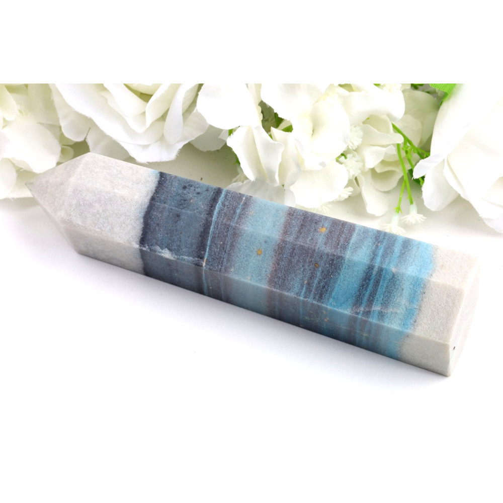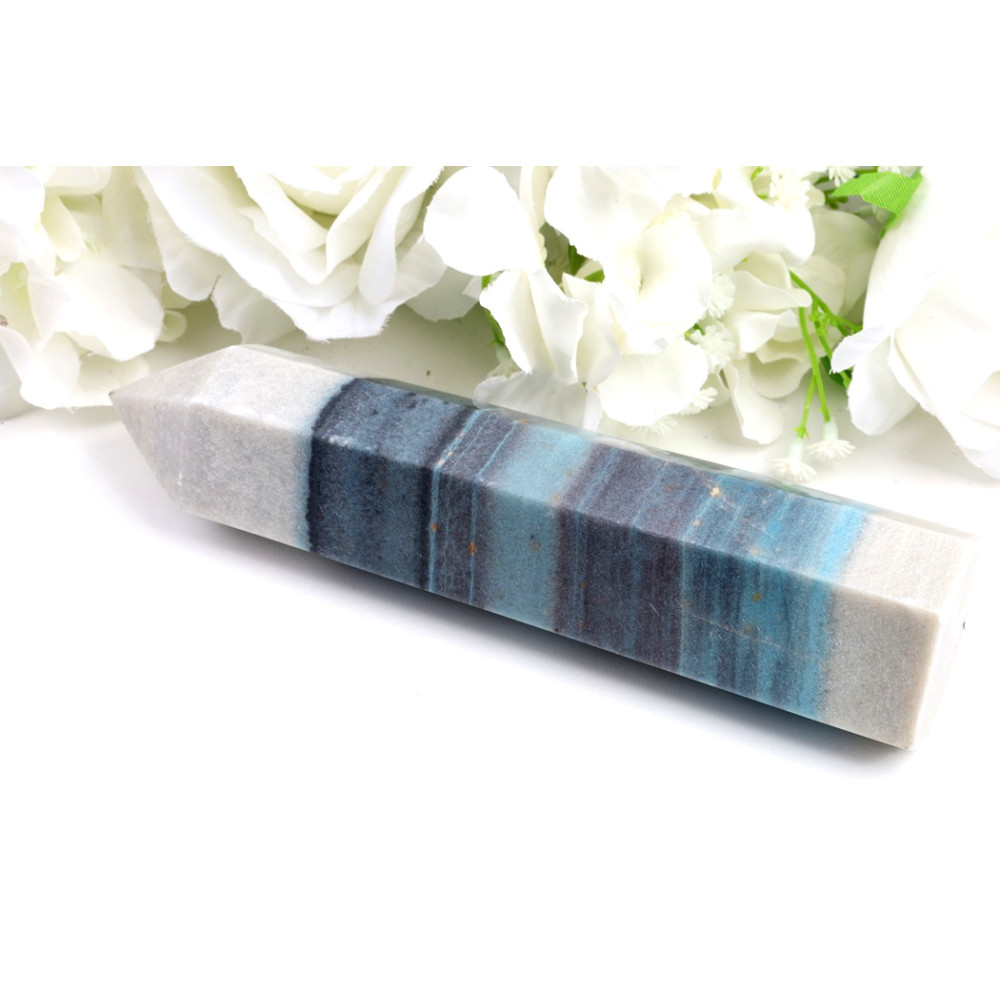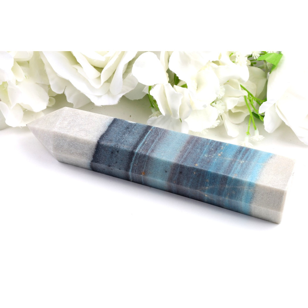 Tento konkrétní kus působí na první pohled velmi uklidňujícím a vyrovnaným dojmem. Jeho leštěný povrch láká k dotyku a hladkost kamene kontrastuje s vnitřní energií, kterou vyzařuje. Přestože je kámen robustní a působí pevně, jeho barvy jsou jemné a éterické, což vytváří pocit lehkosti a hloubky zároveň. Hra světla na leštěném povrchu způsobuje, že se jednotlivé barevné pruhy jemně třpytí a zdánlivě mění odstín v závislosti na úhlu pohledu, což obelisku dodává neustálou vizuální fascinaci.
