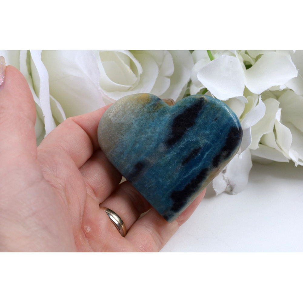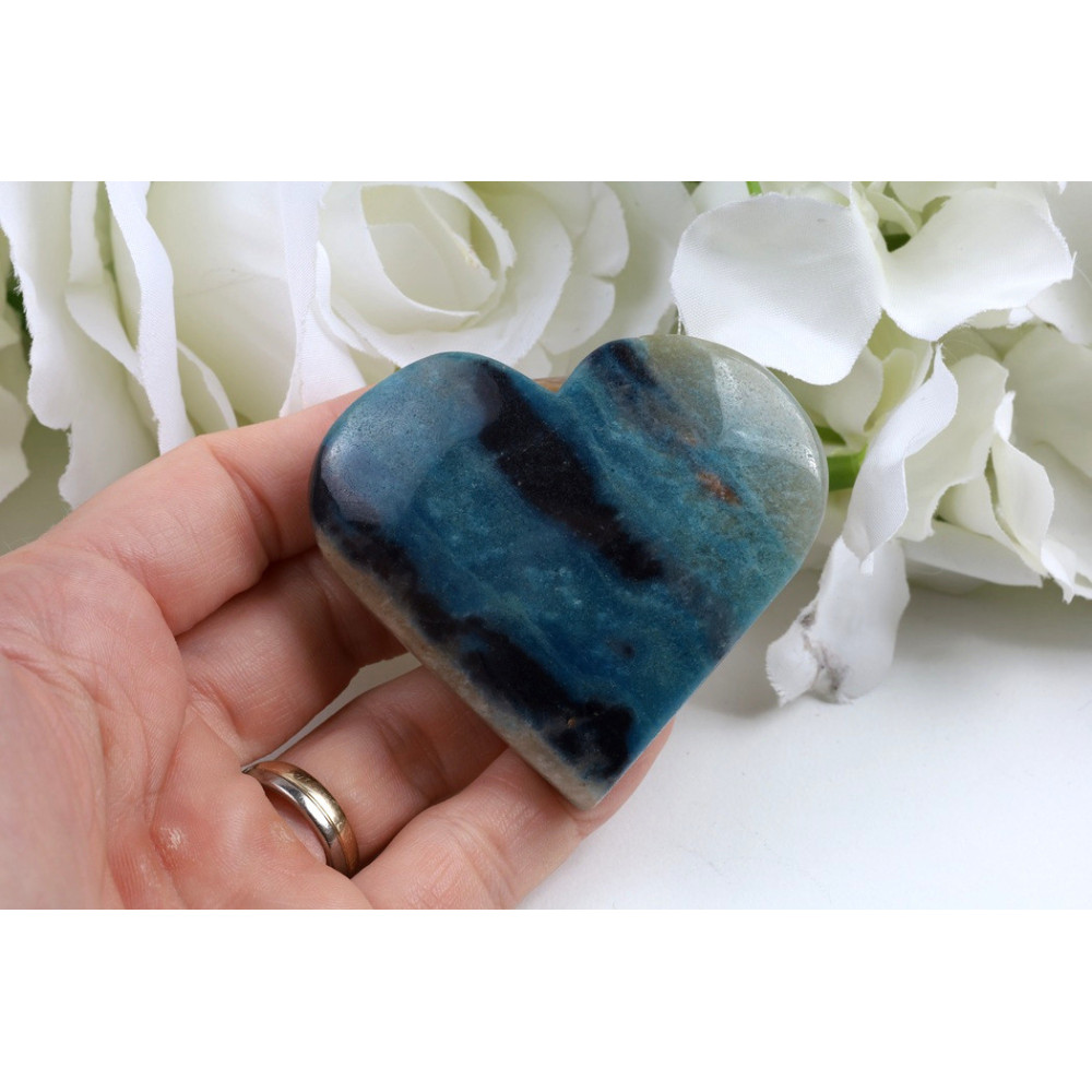 Toto trolleitové srdce zaujme svým výrazným tmavě modrým až fialovým zbarvením s intenzivními odstíny. Povrch kamene je pečlivě vyleštěn do vysokého lesku, který krásně zvýrazňuje přirozenou strukturu minerálu. Viditelné jsou jemné vrstvy a přechody barev, které dávají každému kousku jedinečný charakter. Srdcový tvar je precizně vypracován a kamen působí velmi harmonickým dojmem.