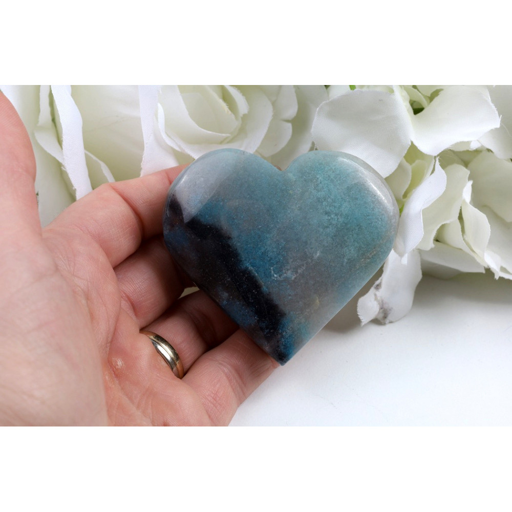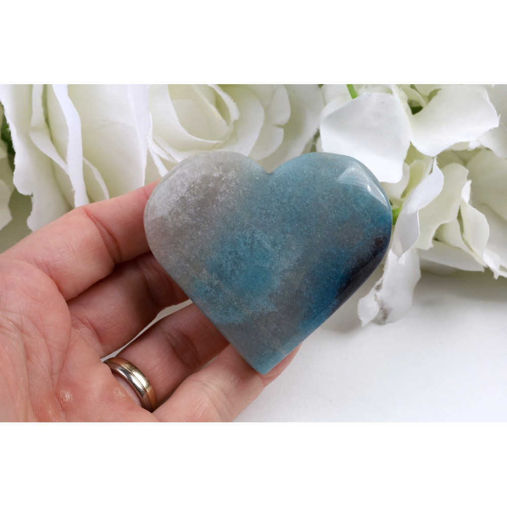 Tento konkrétní kus trolleitu se vyznačuje jemnou světle modrou barvou s nádhernými přechody od světlejší modré v horní části k intenzivnější modré ve spodní části srdce. Kámen má kompaktní strukturu s hedvábným leskem, který podtrhuje jeho jemnou kresbu. Povrch je hladký a příjemný na dotek, ideální pro meditaci a osobní sbírku.