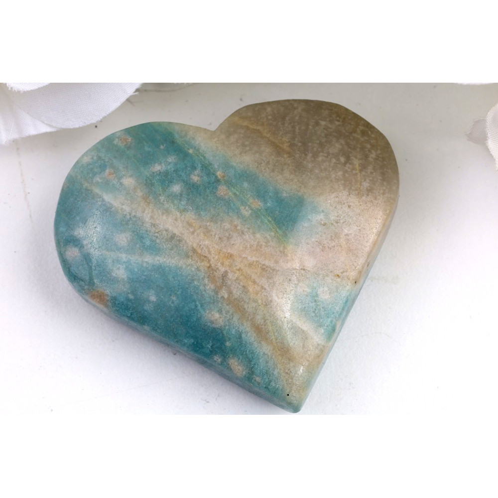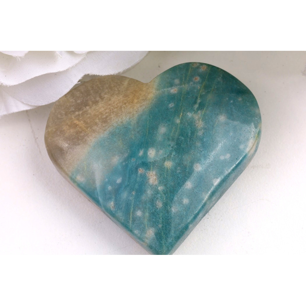 Tento konkrétní, ručně vybraný kus trolleitu ve tvaru srdce vás zaujme svou jemnou, ale výraznou barevnou paletou. Horní část srdce přechází do teplých béžových a pískových tónů, které se elegantně snoubí s chladnější tyrkysově modrou a zeleno-modrou barvou ve spodní části. Celý povrch je krásně hladký a leštěný do vysokého lesku, což podtrhuje jedinečnou vnitřní kresbu minerálu. Můžete si povšimnout drobných, světlejších inkluzí a žilkování, které vytvářejí fascinující a organické vzory, dodávající kameni hloubku a osobitost. Každá strana je unikátní a odhaluje jiný aspekt jeho přírodní krásy.