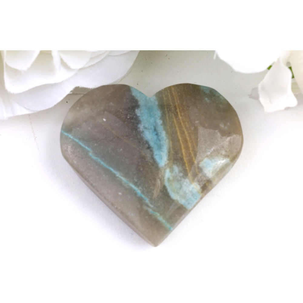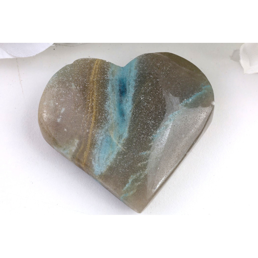 Tento konkrétní, ručně vybraný kus trolleitu ve tvaru srdce zaujme svou unikátní kresbou. Jeho povrch je dokonale leštěný do vysokého lesku, který nechává vyniknout fascinující směs barev. Převažuje zde jemný, šedavě hnědý základ, skrz který se prorývají výrazné, tyrkysově modré a akvamarínové pruhy. Tyto modré tóny se místy prolínají s jemnými zlatavými a okrovými linkami, vytvářejícími dojem starobylých map nebo jemných éterických mraků. Kámen je kompaktní, bez viditelných dutinek či větších inkluzí, což zdůrazňuje jeho hladký a příjemný omak.