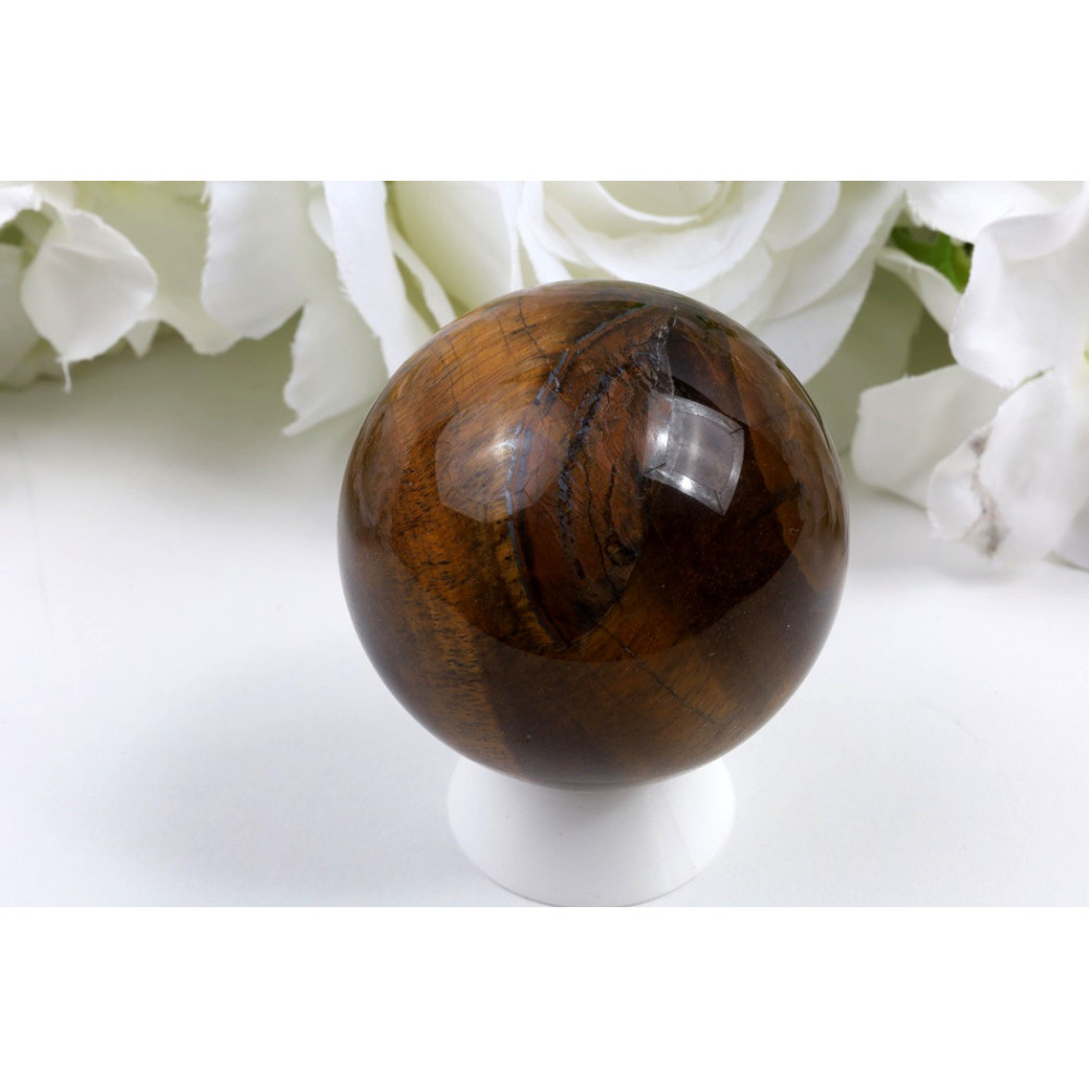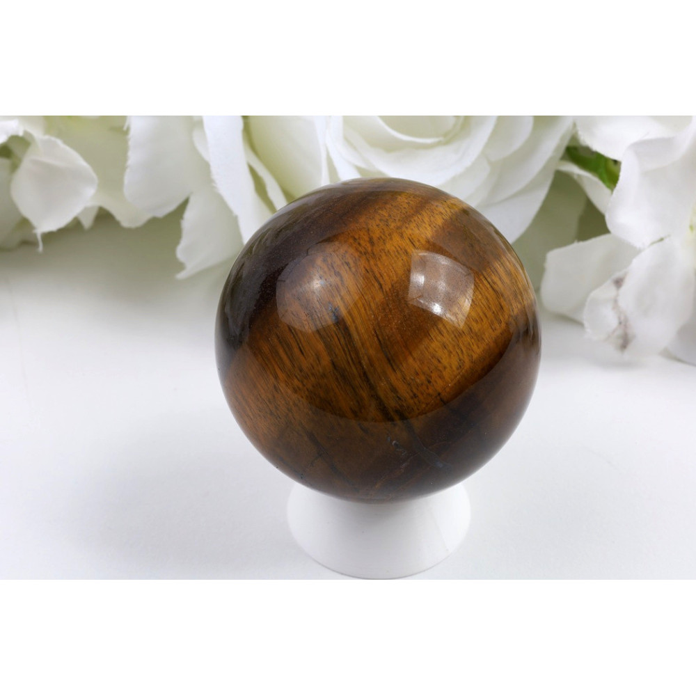 Tato krásná koule o průměru 55 mm zaujme svým tmavě hnědým odstínem s výraznými zlatohnědými chatoyantními pruhy, které vytvářejí efekt kočičího oka. Povrch je dokonale hladký a leštěný, s hedvábným leskem, který zdůrazňuje typické vlnité pásy charakteristické pro kvalitní tygří oko. Odlesky se krásně pohybují po povrchu koule při otáčení, což vytváří fascinující optický efekt.
