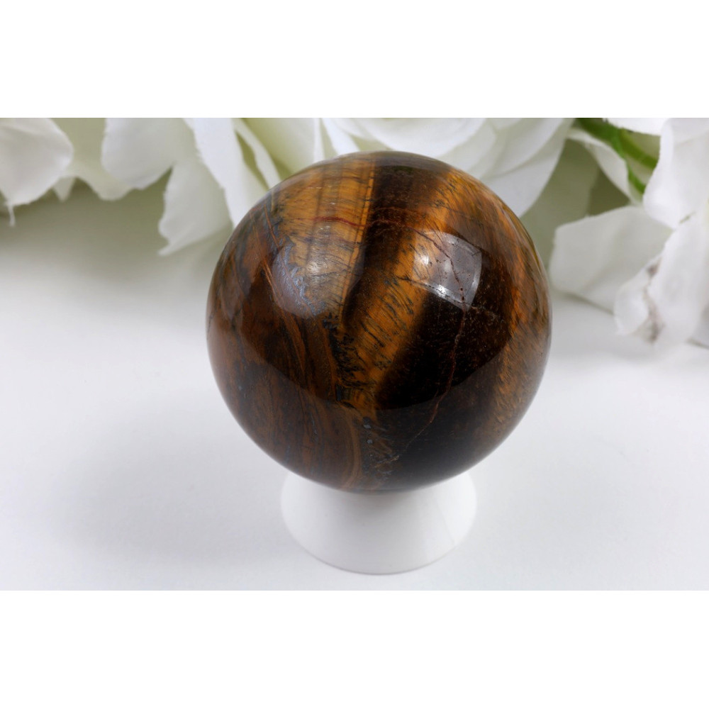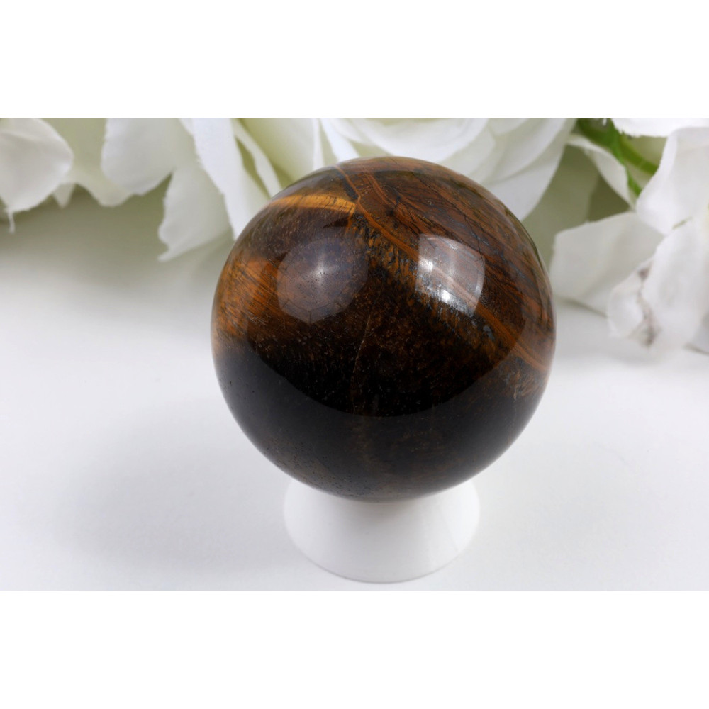 Tato koule je vyrobena z přírodního tygřího oka a vyniká svou tmavě hnědou až čokoládově hnědou barvou s výrazným hedvábným leskem. Zlatohnědé chatoyantní pruhy procházející povrchem kamene vytvářejí fascinující efekt kočičího oka, který dodává kusu jedinečný charakter. Výrazný světelný pruh vedoucí středem koule podtrhuje dokonalé zpracování a kvalitu materiálu. Koule je perfektně vybroušená do kulatého tvaru s hladkým povrchem a jemnými přechody mezi tmavými a zlatavými tóny.