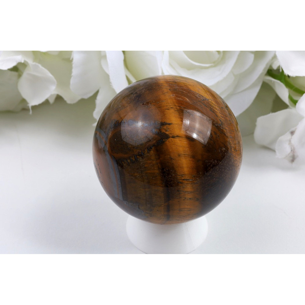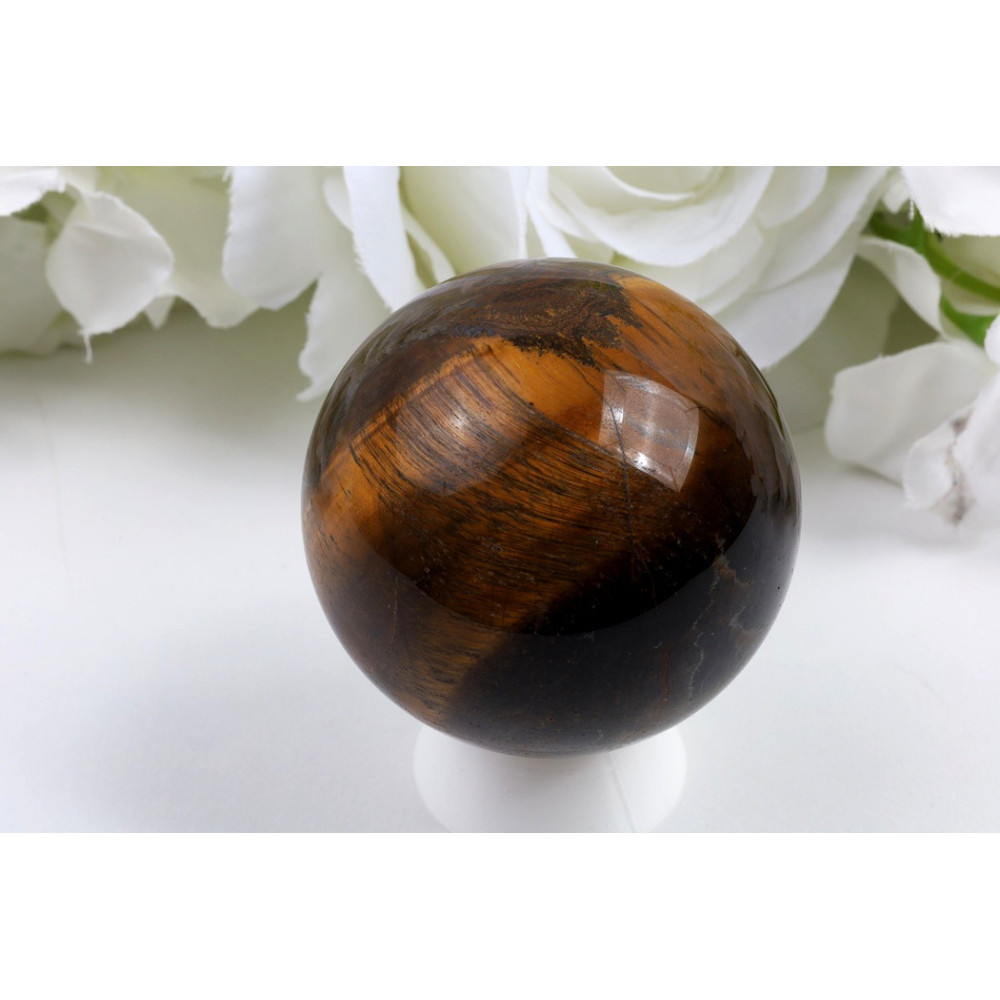 Tato nádherná koule tygřího oka zaujme svými výraznými chatoyantními pruhy v teplých zlatohnědých tónech, které se prolínají s tmavě hnědými plochami. Dokonale vyleštěný povrch odráží světlo a vytváří charakteristický efekt kočičího oka s hedvábným leskem. Barvy přecházejí od tmavě hnědé až po medově zlatou, což vytváří harmonickou kresbu přírodního minerálu. Každý úhel pohledu odhaluje jinou hru barev a odlesků.