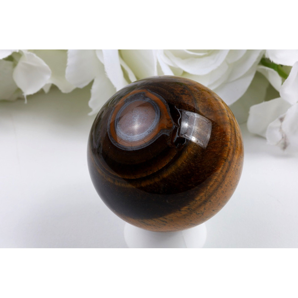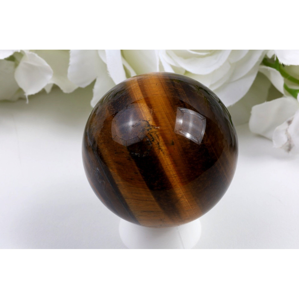 Tato impozantní koule tygřího oka s průměrem 59 mm zaujme na první pohled svým výjimečným vzhledem. Povrch je dokonale vyleštěný do vysokého lesku, který podtrhuje hlubokou tmavě hnědou až čokoládovou barvu kamene. Charakteristické zlatohnědé chatoyantní pruhy vytvářejí na povrchu fascinující optický efekt kočičího oka, který se mění při pohybu světla. Hedvábný lesk a jemné přechody mezi odstíny dodávají kouli elegantní a luxusní vzhled. Jedná se o působivý kus ideální pro sběratele i milovníky dekorativních minerálů.