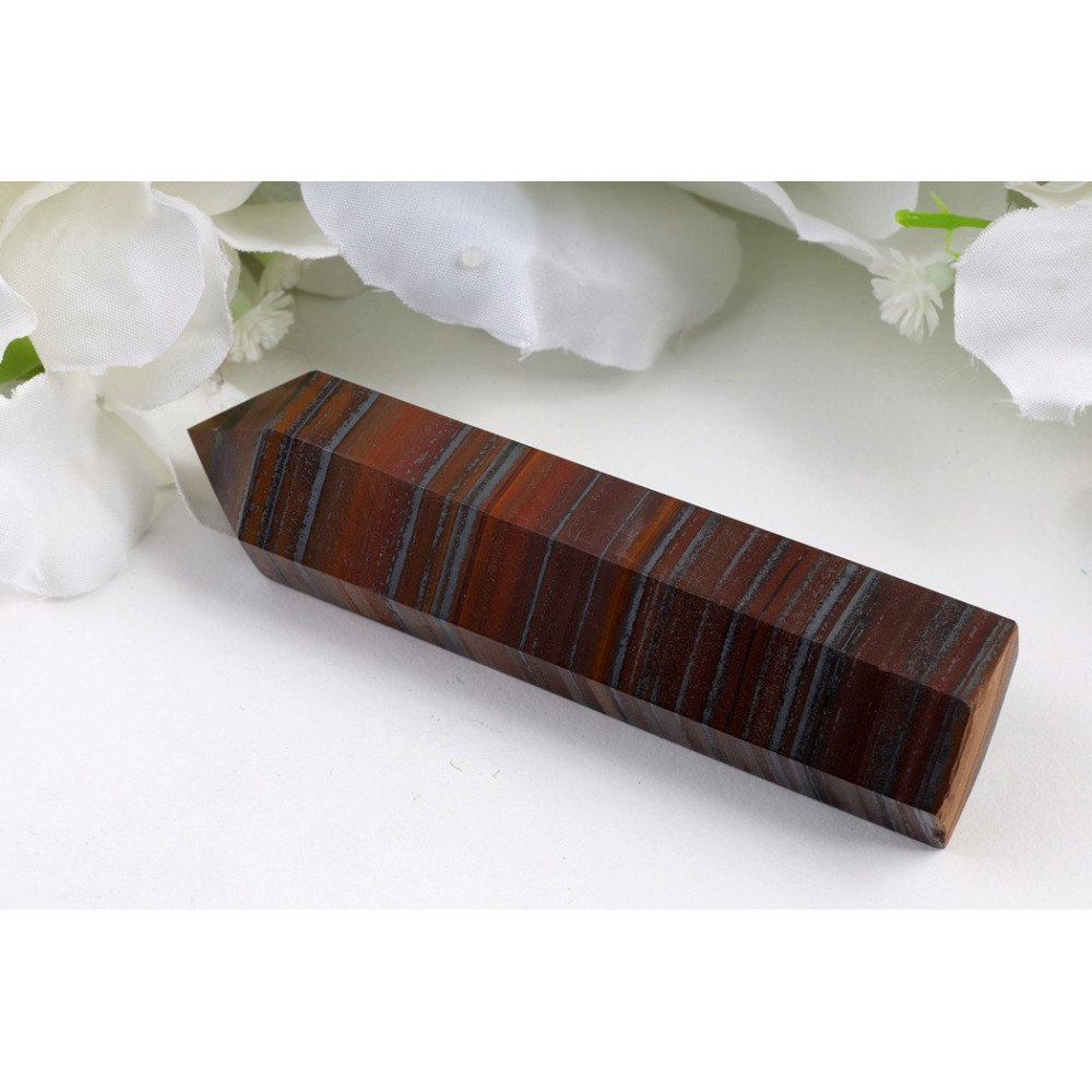 Tento obelisk z tygřího železa okouzlí svým výjimečným vzhledem. Spodní část kamene zdobí tmavě červenohnědé tóny protkané jemnými zlatohnědými proužky a žílkami, které vytváří typickou kresbu připomínající srst dravé šelmy. Horní zakončení vyniká výrazným světlým, téměř krémově bílým zakončením, které dodává kameni jedinečný kontrast a eleganci. Celý povrch je dokonale vyleštěný do vysokého lesku, což zvýrazňuje hloubku barev a přírodní kresbu minerálu. Tento kus je skutečným solitérem mezi dekorativními kameny.