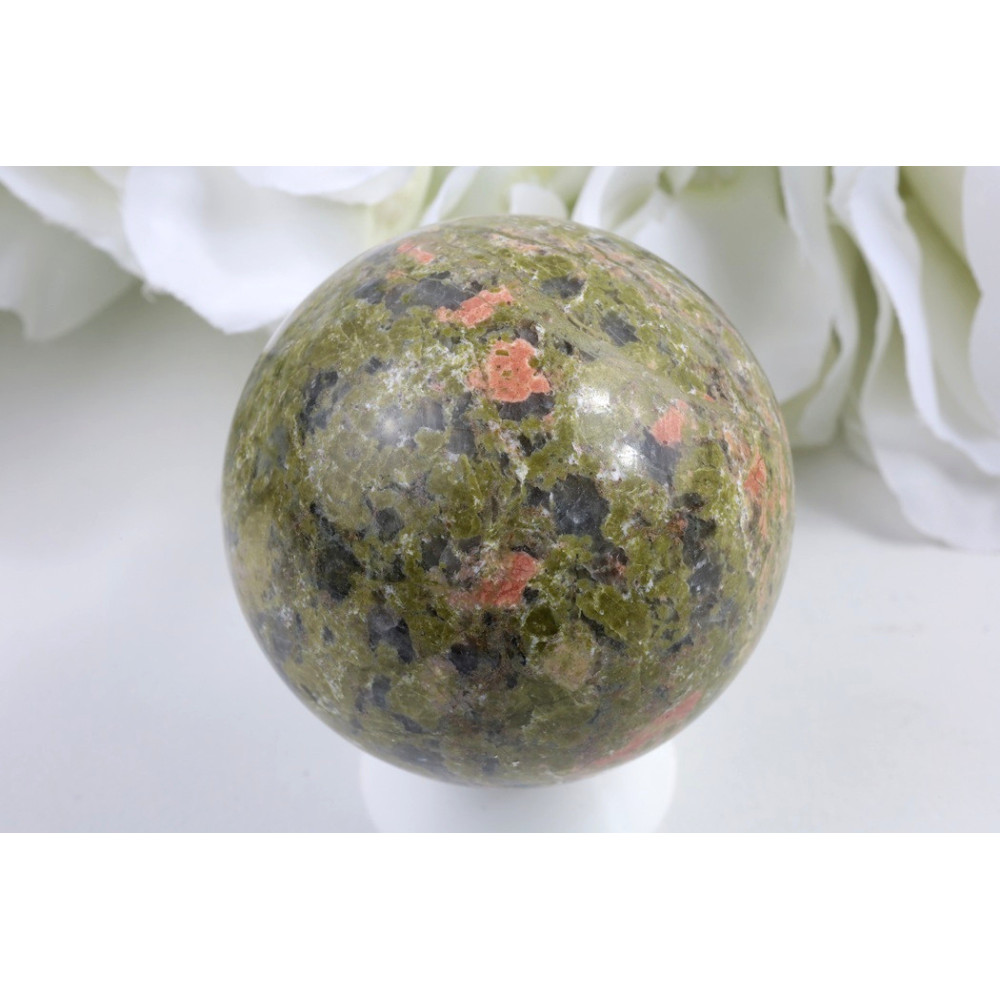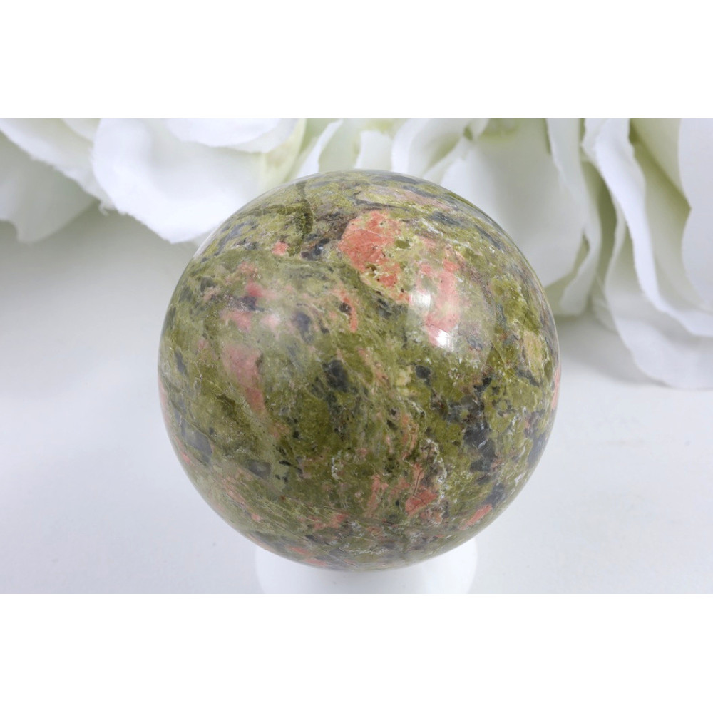 Tento konkrétní kus unakitu zaujme svou výraznou zeleno-růžovou kresbou, která vytváří harmonické spojení přírodních tónů. Povrch koule je pečlivě vyleštěn do vysokého lesku, díky čemuž krásně odráží světlo a zvýrazňuje jedinečnou strukturu minerálu. Charakteristická kombinace jemných zelených ploch epidotu s teplými růžovými partiemi živce vytváří malebnou texturu, která je pro každý kus unakitu zcela jedinečná.