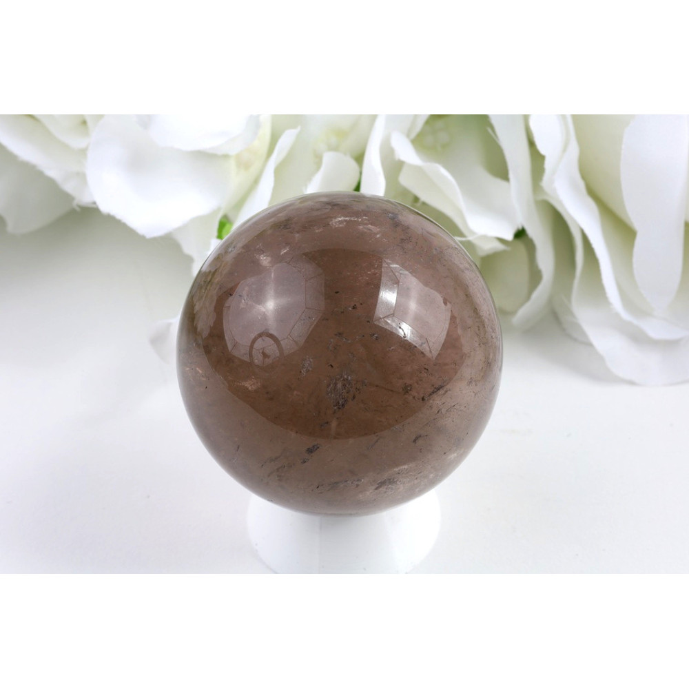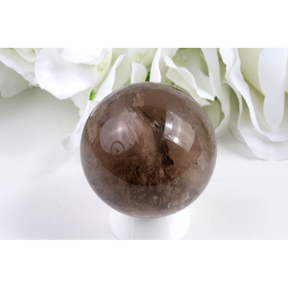 Tento nádherný exemplář koule záhnědy se vyznačuje středně tmavým kouřovým zbarvením s jemnými tmavšími pruhy a přechody. Povrch koule je pečlivě vybroušen a vyleštěn do vysokého lesku, který umocňuje hloubku kouřového zbarvení a vytváří fascinující optické efekty při otáčení. Kouřová barva je rovnoměrně rozložena s jemnými nuancemi, které dodávají kameni přirozený a tajemný charakter. Díky dokonalému kulovému tvaru a perfektnímu leštění působí kámen velmi elegantně a luxusně.