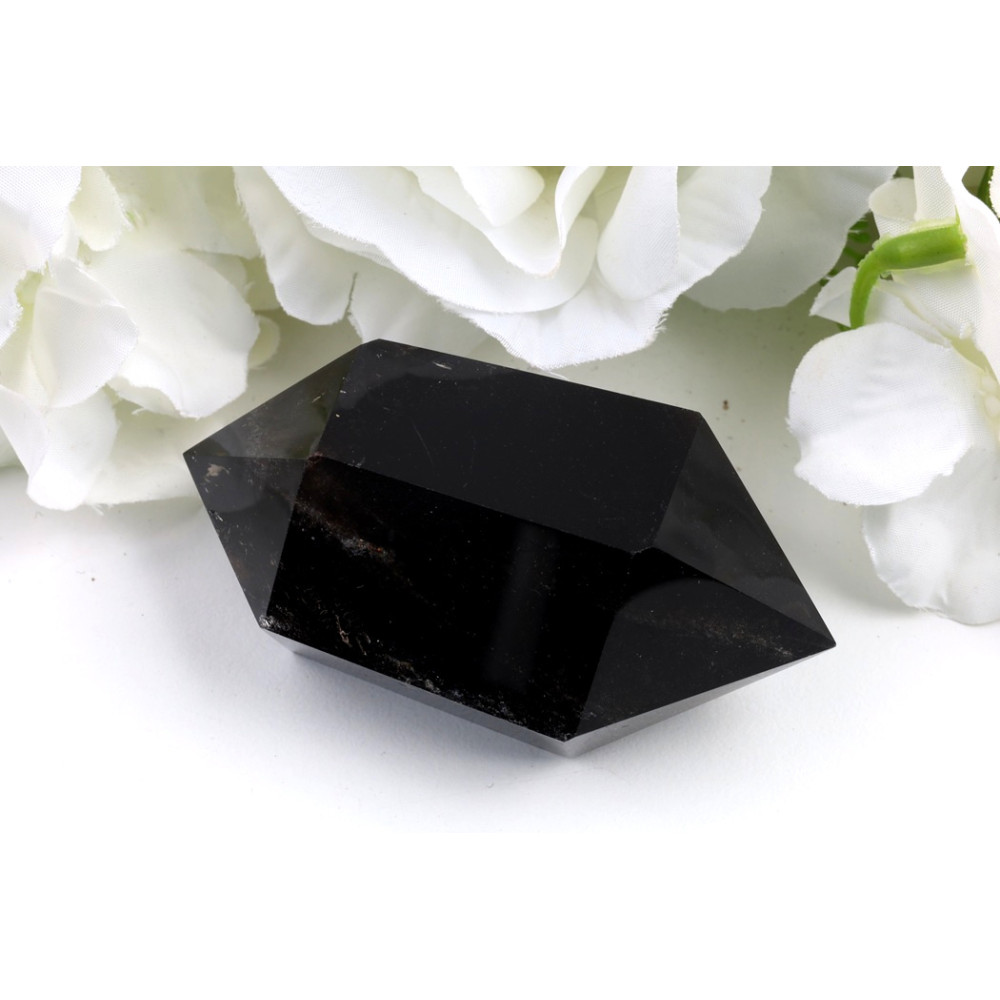 Tento konkrétní krystal záhnědy se pyšní sytě kouřově hnědou, téměř černou barvou, která na některých místech přechází do jemnějších, průsvitných odstínů. Jeho povrch je dokonale hladký a leštěný, což mu dodává nádherný lesk, který se elegantně odráží ve světle. Dvojitý hrot je precizně opracován, s ostrými a čistými hranami, které podtrhují jeho geometrickou krásu.