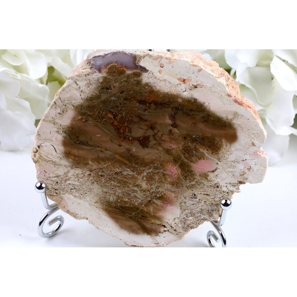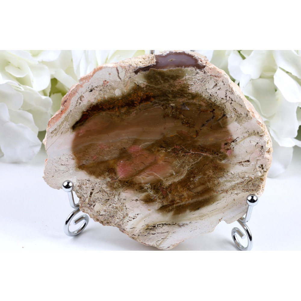Tento plátek zkamenělého dřeva zaujme svou krásnou středně hnědou barvou s jemnými béžovými odstíny, které vytvářejí harmonický barevný přechod. Na povrchu jsou výrazně patrné letokruhy a dřevěná struktura, která vypovídá o původní anatomii stromu. Oboustranně leštěný povrch poskytuje jemný lesk a zdůrazňuje přirozené kresby. Světlejší okraje kontrastují s tmavším středem, což dodává plátku jedinečný vizuální charakter.
