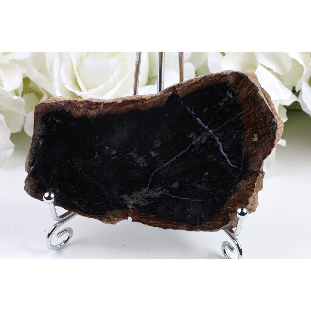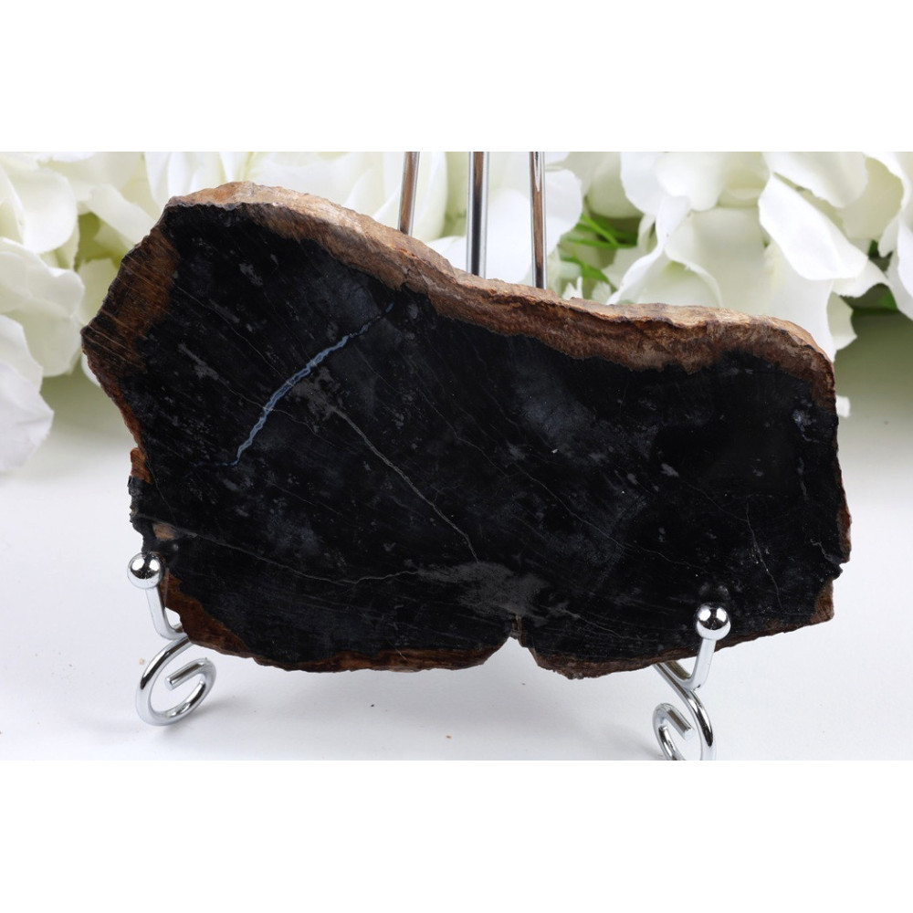 Tento plátek zkamenělého dřeva vyniká tmavě hnědou až černohnědou barvou, která dodává kusu elegantní a hluboký vzhled. Povrch je oboustranně pečlivě vyleštěn do vysokého lesku, který zvýrazňuje jemnou kresbu dřevních vláken a výrazné výroční letokruhy. Hnědé odstíny se prolínají s tmavšími partiemi a vytvářejí přirozený, harmonický vzor. Leštěný povrch odráží světlo a podtrhuje jedinečnou texturu tohoto prehistorického materiálu.