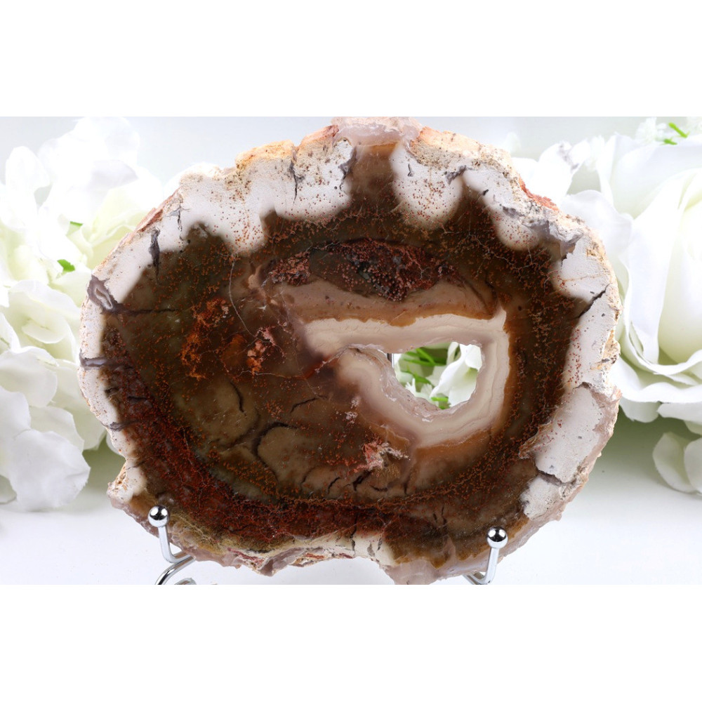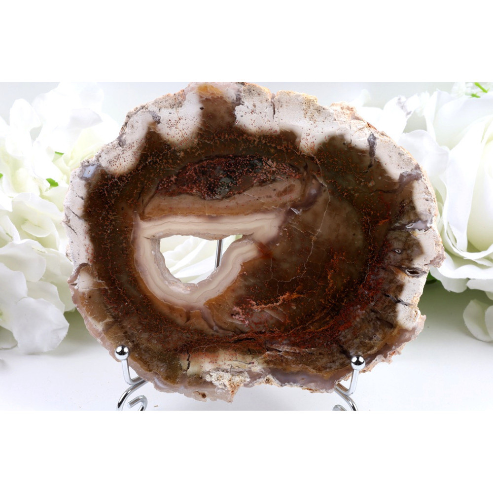 Tento plátek zkamenělého dřeva očaruje svým autentickým vzhledem, který zachovává miliony let starou strukturu původního dřeva. Povrch zdobí tmavě hnědé až rezavě hnědé tóny s plynulými přechody do světlejších béžových a okrových odstínů. Výrazná letokruhová kresba se soustřednými kruhy vytváří fascinující přírodní vzor, který je na každém kusu jedinečný. Oboustranně leštěný povrch působí efektně a odráží světlo v jemném zrcadlovém odlesku, čímž zvýrazňuje bohatou barevnost a přirozenou texturu zkameněliny.