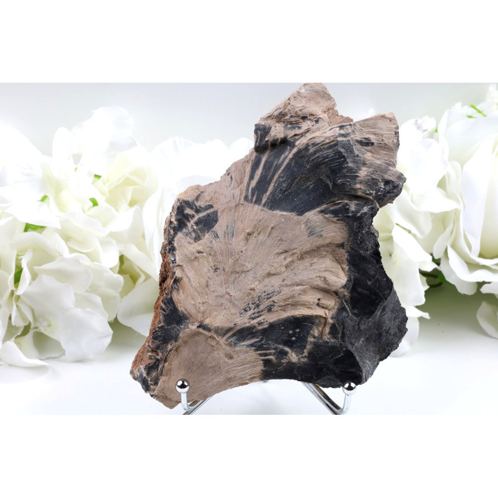 Tento plátek zkamenělého dřeva uchvátí svou výraznou tmavě hnědou až černohnědou kresbou dřevních vláken, která vytváří jedinečný přírodní vzor. Povrch je dokonale vyleštěný s jemnými odlesky, které zdůrazňují přirozenou strukturu zkamenělého dřeva. Druhá strana plátku nabízí kontrast s světlejšími béžovo-hnědými odstíny. Každý kus je originál s vlastním charakterem daným miliony let trvající přeměnou.