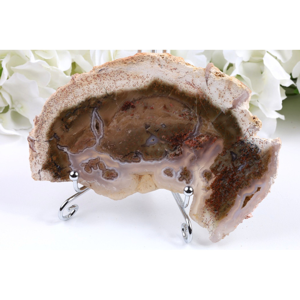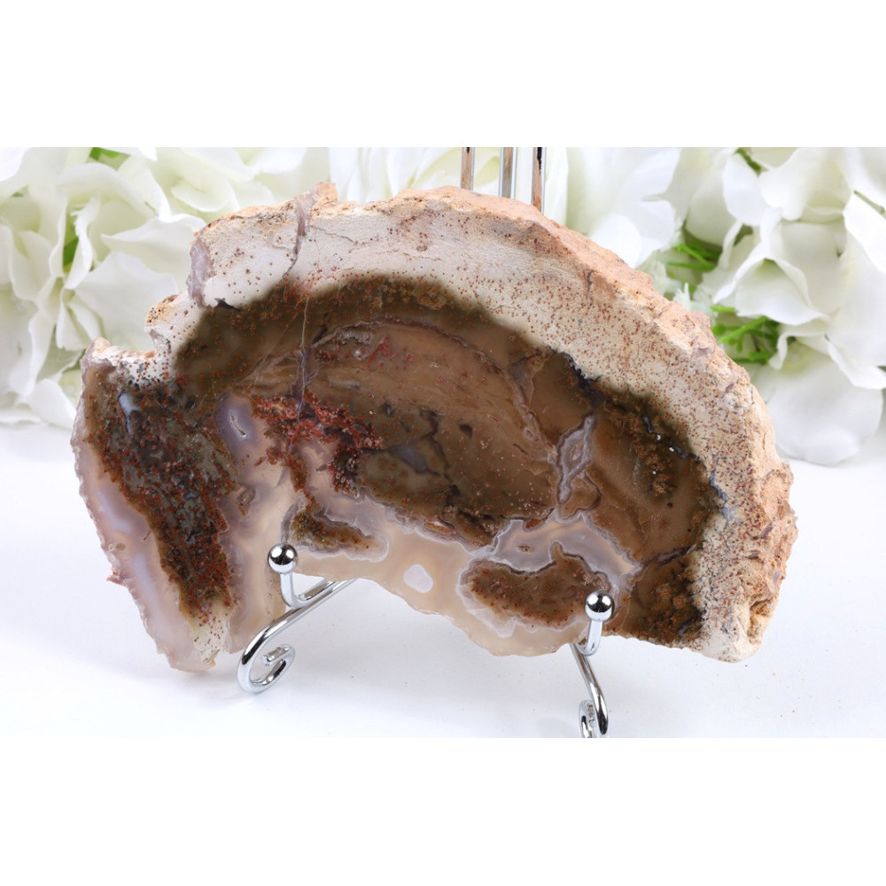 Tento leštěný plátek zkamenělého dřeva z lokality Garud v Indonésii zaujme svou bohatou kresbou letokruhů v teplých hnědých odstínech. Oboustranně leštěný povrch odhaluje jemné přechody mezi světlejšími a tmavšími pásmy, které vytvářejí přirozenou strukturu dřeva. Na prvý pohled upoutá výrazná textura s patrnou mineralizací, která se odráží v lesklém povrchu. Kresba připomíná proud času, jenž se zastavil před miliony let.