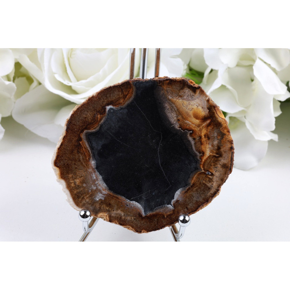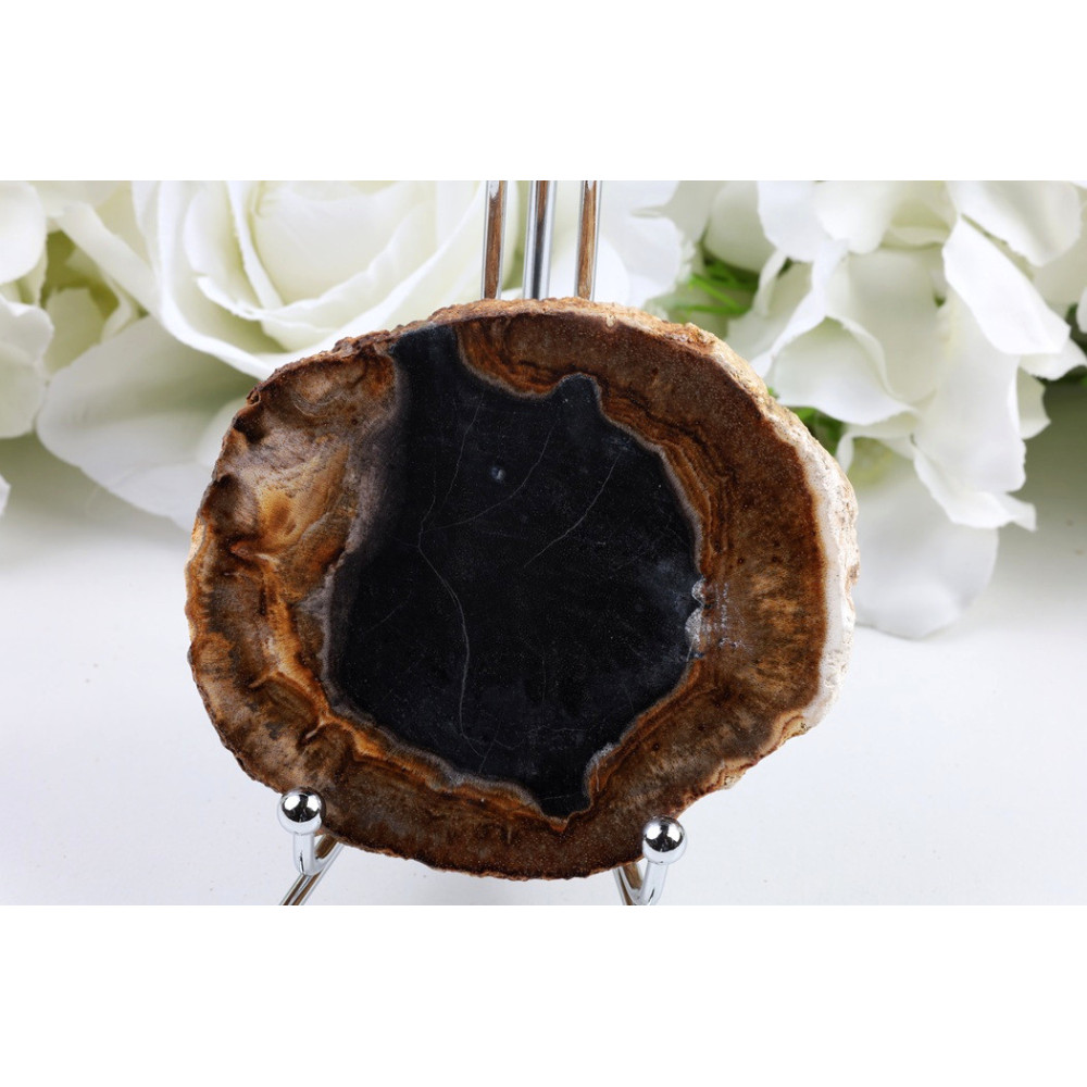 Tento menší, ale neméně okouzlující plátek zkamenělého dřeva se vyznačuje intenzivní tmavě hnědou barvou s odstíny čokoládové až téměř černé. Povrch kamene je oboustranně vyleštěn do hedvábného lesku, který zvýrazňuje bohatou strukturu dřeva. Výrazně viditelné letokruhy a dřevní vlákna vytvářejí organickou kresbu plnou detailů. Každá strana plátku odhaluje jiný pohled na strukturu pravěkého stromu - místami jsou patrné hustší prstence, jinde se vlákna vine v jemných vlnách. Kompaktní velikost činí z tohoto kusu ideální kousek pravěké historie do dlaně.